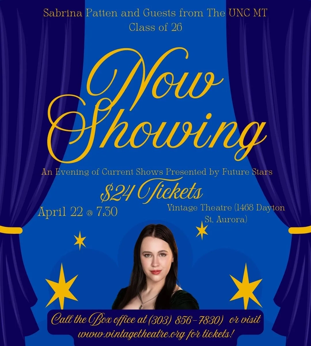 "Now Showing" is a night filled with Broadway and West End's newest and current hits! Join Sabrina Patten and featured guests from the Senior Musical Theatre class of UNC for a night full of theatre's newest hits by its future stars! Featuring songs from shows such as Chess, Death Becomes Her, The Lightning Thief, and more fan favorites. "Now Showing" promises a night of stellar performers by some of the best and brightest performers UNC has to offer as they prepare to launch their careers in musical theatre!"